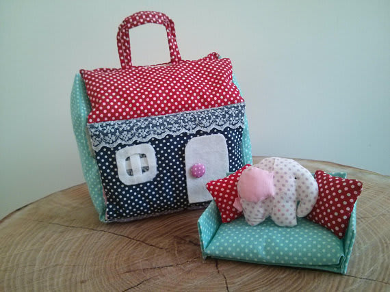 COLORFUL Children's verry soft dollhouse made of fabric cotton and felt, filling wadding (soft batting) and small elephant toy and sofa (measure approx 10.3 cm width and lenght 7.3 cm) with 2 pillows (measure approx 4.5 cm x 4cm). The white felt was used for decoration of the door and window, there is small button for door handle, wadding is for the walls of the house and the elephant. The walls are of a different color - dark blue, light blue, pink, violet, beige and red, which helps the child to learn the colors. The size of the little elephant is 6.5 cm (2.5 inches) to 5.5 cm (2.1 inches).RED dollhouse made of fabric cotton and felt, filling wadding (soft batting). This set contain - doll, cat, bed, 2 pillows and blanket. This dollhouse is made with a wonderful colorful combination of red and red on white dots. Polka dots for more effect! The velcro is used to easily open and close the house. The portable small house is made with small handles so the little ladies can take it for a walk.