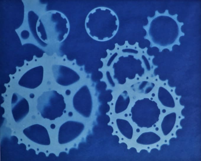 Usually in cyanotypes the aim is for the background painted surface to be as smoothly covered as possible. This allows the rich blue color, caused by the sunlight, to stand out against the white of the shadow. Lisa enjoys working with bicycle gears, ferns, and other objects.